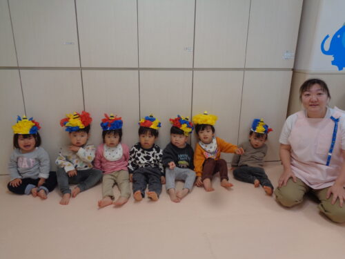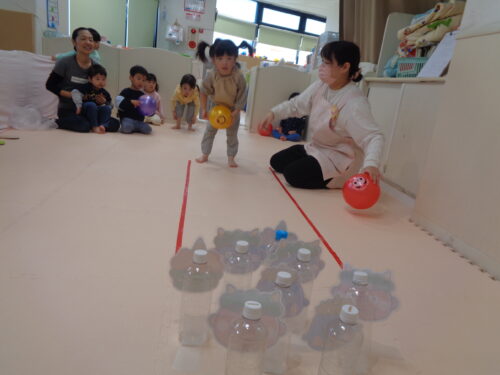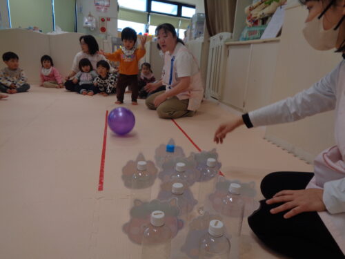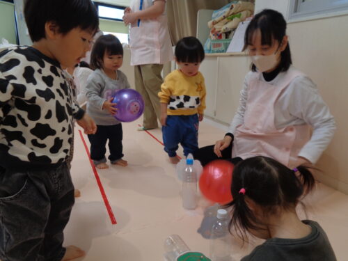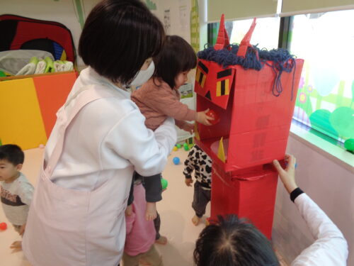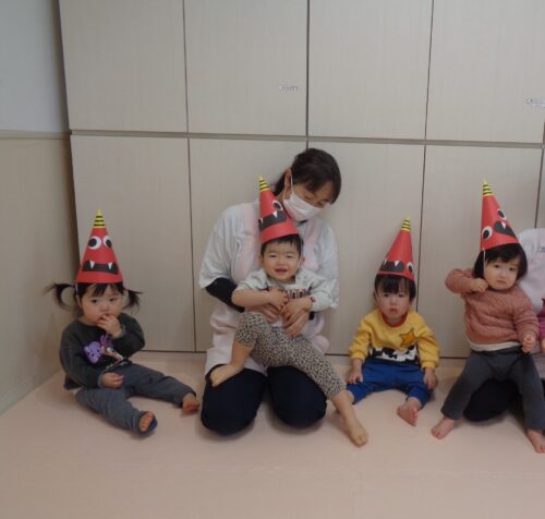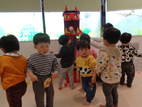 令和8年2月3日(火)節分の会を行ないました。節分についてのお話を聞いた後は、みんなで鬼退治をテーマにしたゲームを楽しみました。写真は、「ペットボトルボーリング」の様子です。鬼の顔がついたピンをめがけて、ボールを投げました。ピンが倒れると皆で拍手をして大喜び👹もう一つのゲームは、「玉入れ」です。鬼のお口の中にどんどんボールを投げ入れていきます。最後に、鬼の帽子やお面をつけてみんなで記念撮影です📷今年も楽しい節分の会となりました!