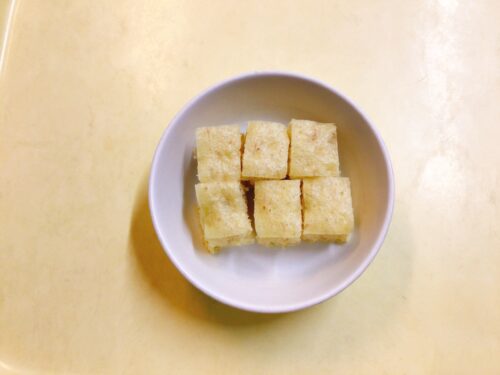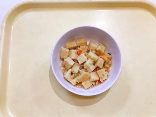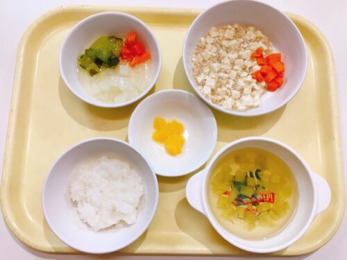 おかゆ 豆腐のそぼろあん 大根サラダ さつまいものスープ オレンジ