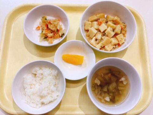ごはん 厚揚げのそぼろあん かみかみサラダ もやしのスープ(豚肉なす) オレンジ
