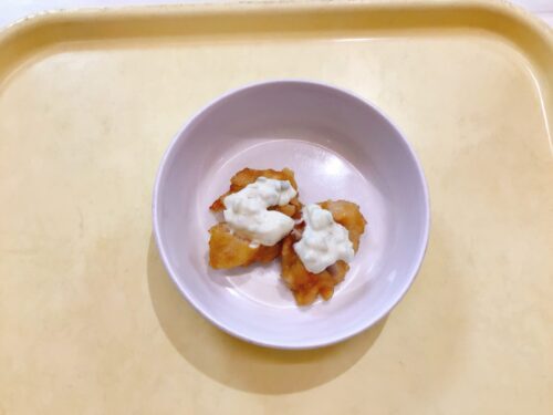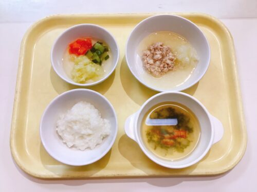 おかゆ 鶏肉と玉葱の煮物 キャベツのサラダ 味噌汁