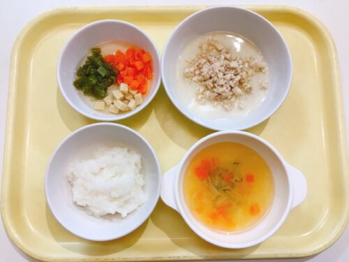 おかゆ 鶏肉の煮物 高野豆腐と野菜の煮物 味噌汁