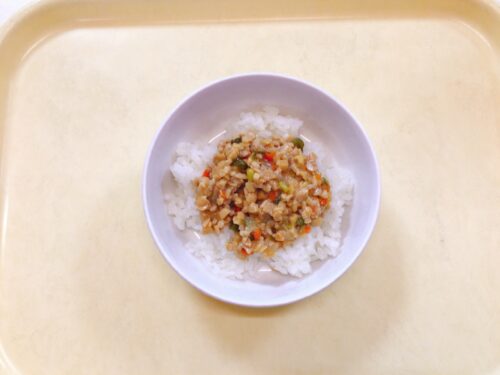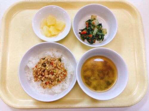納豆そぼろ丼 ほうれん草のごま和え 味噌汁(えのき油揚げわかめ) パイン缶
