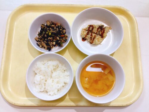ごはん 白身魚フライ ひじきの炒り煮 味噌汁(さつま芋長葱麩)