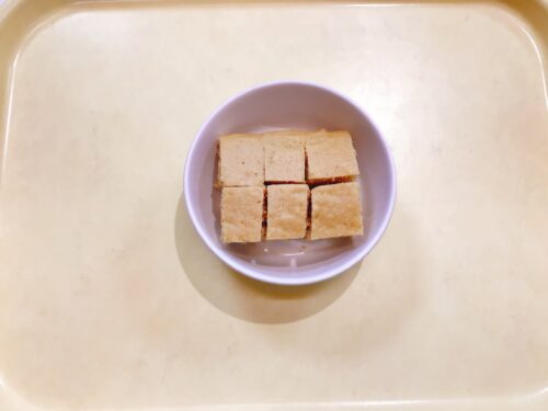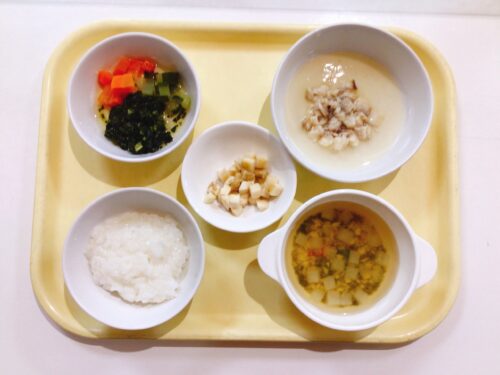 おかゆ たらの味噌煮 小松菜の和え物 すまし汁 バナナ