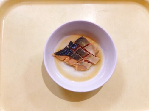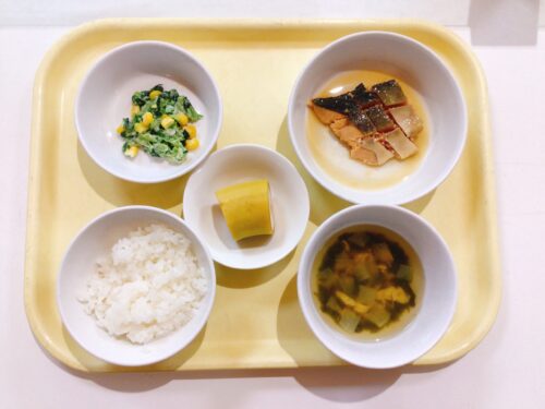 ごはん 鮭の味噌煮 小松菜マヨ和え すまし汁(大根鶏肉わかめ) バナナ