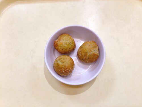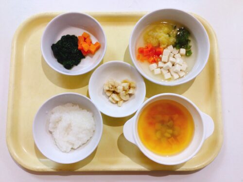 おかゆ 豆腐と野菜の煮物 ほうれん草の和え物 味噌汁 バナナ