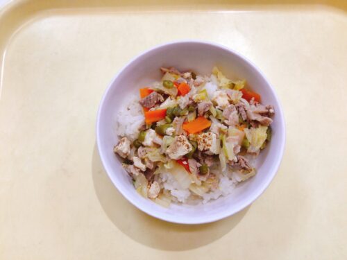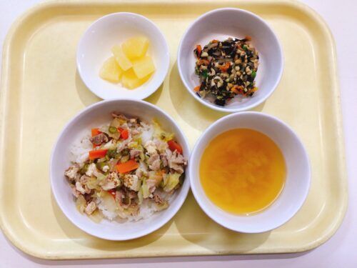 すき焼き風丼 納豆はりはり和え 味噌汁(南瓜玉ねぎ) パイン缶