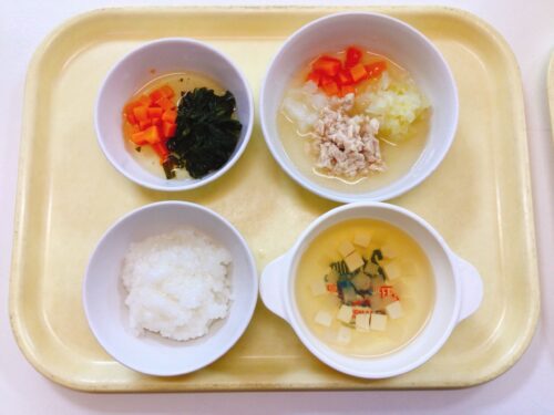 おかゆ 鶏肉と野菜の味噌煮 ちんげん菜の和え物 大根のスープ
