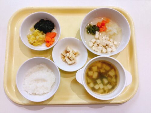 おかゆ 豆腐と野菜の煮物 ほうれん草の和え物 味噌汁 バナナ
