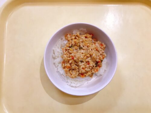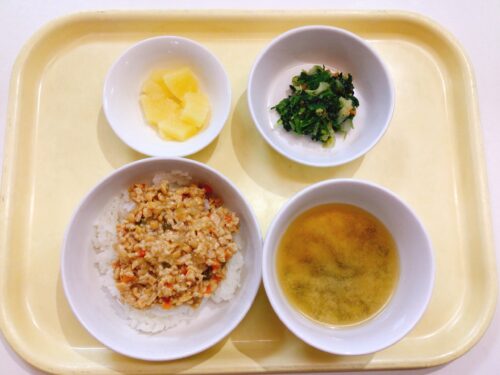 納豆そぼろ丼 ほうれん草のごま和え 味噌汁(えのき油揚げわかめ) パイン缶