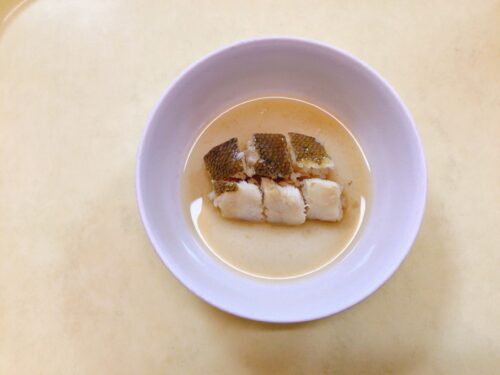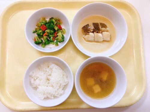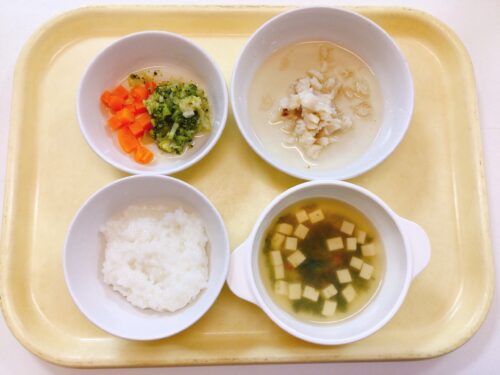 おかゆ たらの煮付け ブロッコリーの和え物 味噌汁