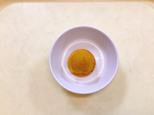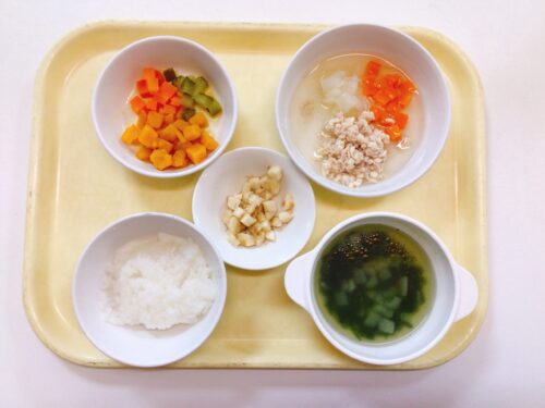 おかゆ 鶏肉と野菜の煮物 かぼちゃサラダ 小松菜のスープ バナナ