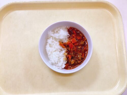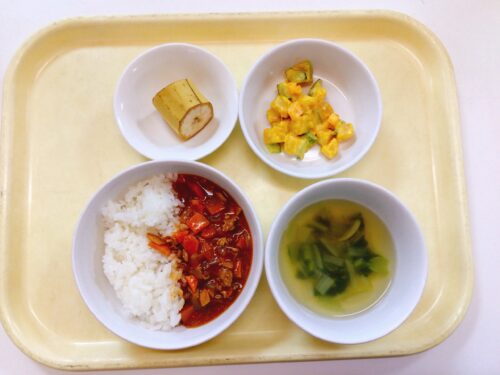 ハヤシライス かぼちゃサラダ 小松菜のスープ(玉ねぎ) バナナ