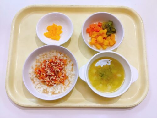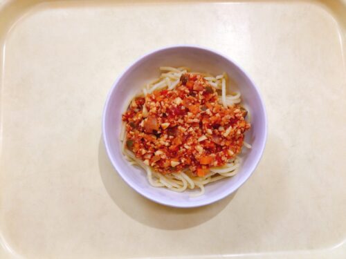 ミートソースうどん かぼちゃサラダ 白菜のスープ オレンジ