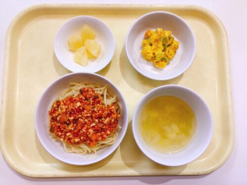 豆たっぷりスパゲティミートソース かぼちゃサラダ 白菜のスープ(じゃが芋) パイン缶