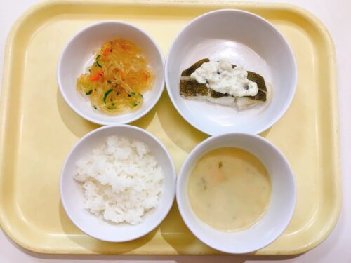 ごはん かれいのタルタル焼 春雨サラダ 豆乳味噌汁(厚揚げえのきわかめ)