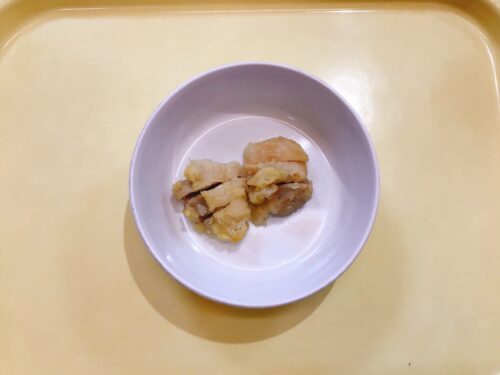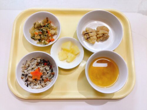 ひじきごはん 塩唐揚げ もやしのおひたし 味噌汁(里芋キャベツ) パイン缶