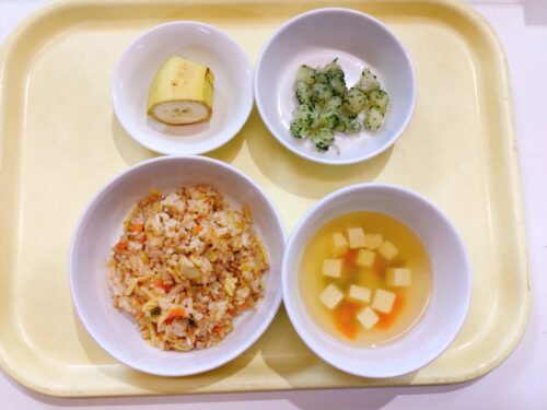 おかゆ 鶏肉と野菜の煮物 じゃが芋としらすの煮物 豆腐のスープ バナナ