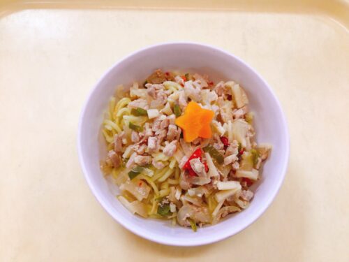 チンジャオうどん 大根の和え物 味噌汁 バナナ