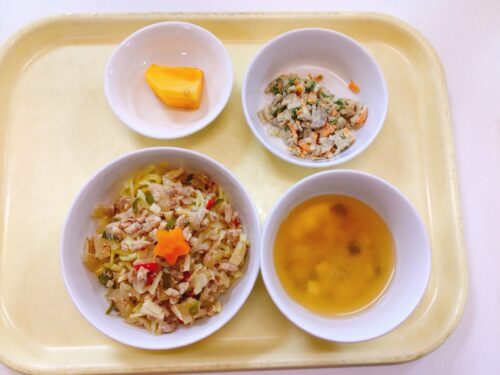 チンジャオ焼きそば 根菜ごまマヨサラダ 味噌汁(豆腐里芋万能ねぎ) 柿