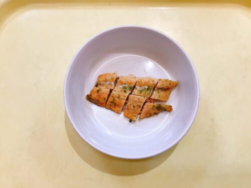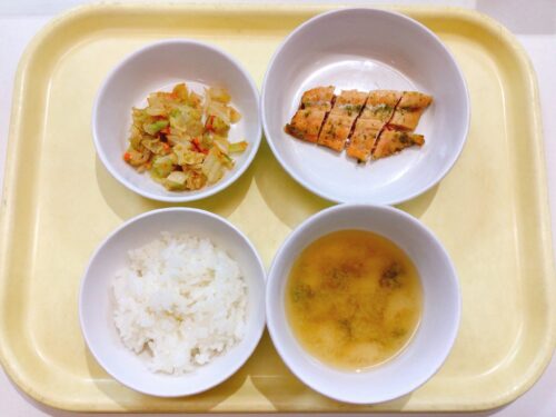 ごはん 鮭の磯辺揚げ キャベツのごま和え 味噌汁(さつま芋麩万能ねぎ)