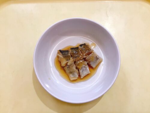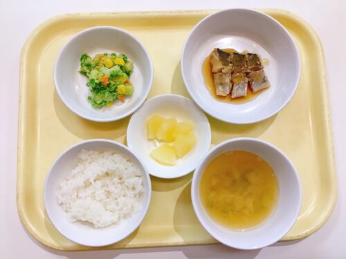 ごはん たらの煮付け グリーンポテトサラダ 味噌汁(鶏肉えのきちんげん菜) パイン缶