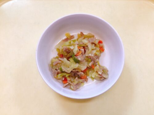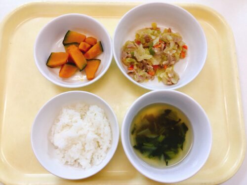 ごはん 回鍋肉 南瓜の煮物 ほうれん草のスープ(玉ねぎ)