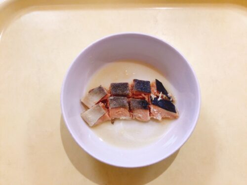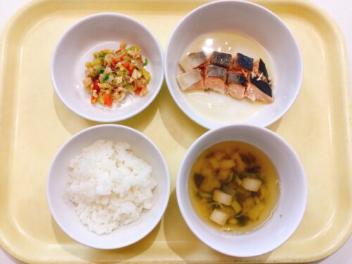 ごはん 鮭の味噌煮 白菜のおかか和え すまし汁(麩わかめ長ねぎ)