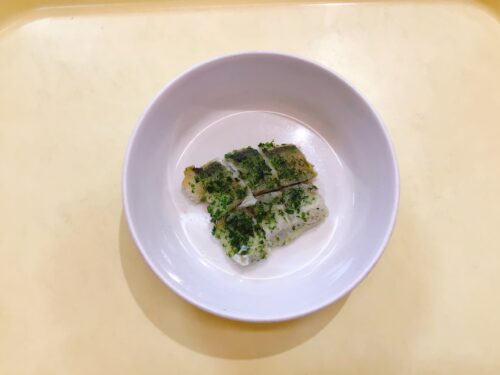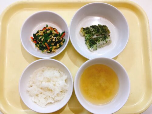 ごはん たらの磯辺焼き ほうれん草の納豆和え 味噌汁(えのきキャベツ油揚げ)