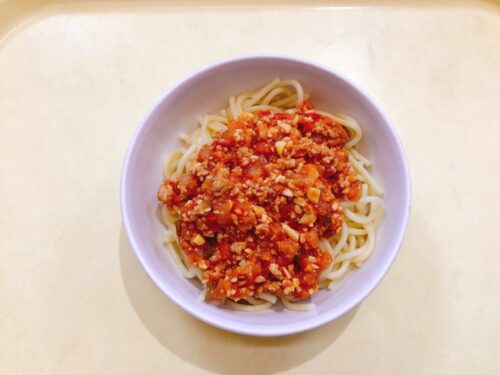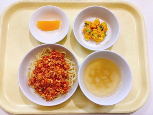 ミートソースうどん 南瓜サラダ かぶのスープ オレンジ