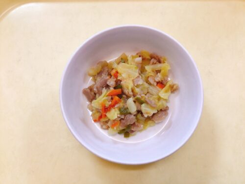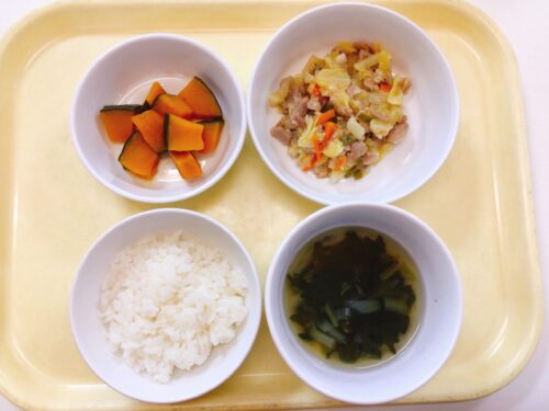 ごはん 回鍋肉 南瓜の煮物 ほうれん草のスープ(玉ねぎ)