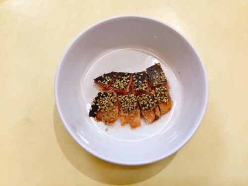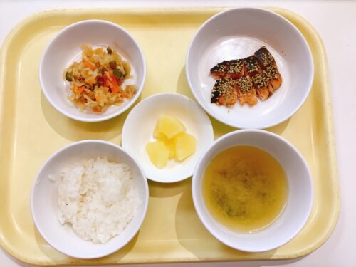 ごはん 鮭のごま漬け焼き 切干大根の煮物 味噌汁(小松菜えのき) パイン缶