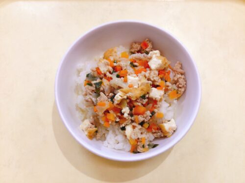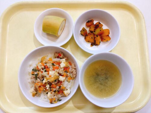 厚揚げと野菜そぼろ丼 大学南瓜 味噌汁(もやしなめこわかめ) バナナ