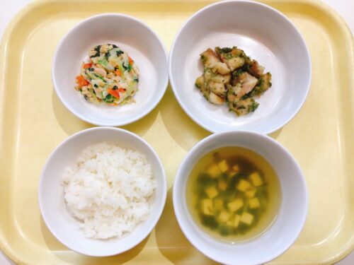 ごはん のり塩からあげ 納豆マヨサラダ 豆腐のスープ(玉ねぎわかめ)