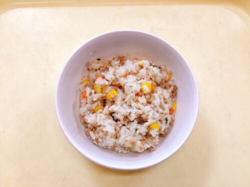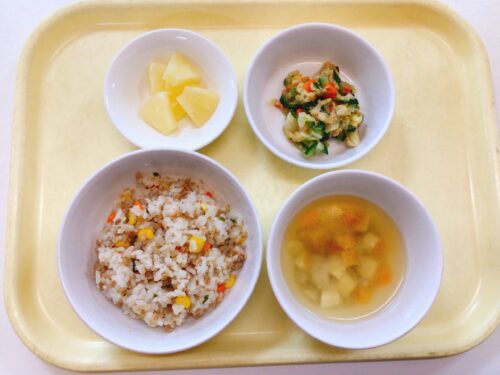 五目チャーハン 胡瓜とツナの和え物 味噌汁(厚揚げしめじ人参) パイン缶