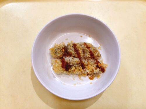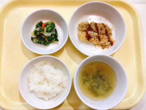 ごはん 白身魚フライ ほうれん草のごま和え 味噌汁(玉ねぎごぼうわかめ)