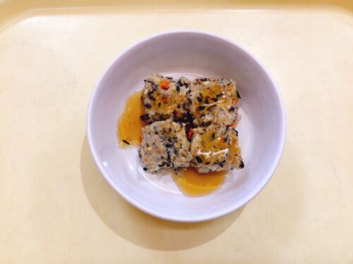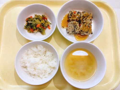 ごはん ひじき入り和風ミートローフ 小松菜のソテー 味噌汁(白菜しめじ麩)