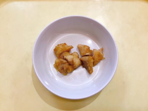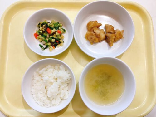 ごはん 鶏肉の唐揚げ 小松菜と油揚げのおひたし 味噌汁(大根ちんげん菜)