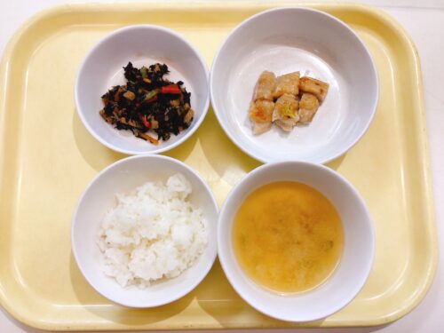 ごはん 鶏肉のねぎ塩焼き ひじきの五目煮 味噌汁(大根油揚げ万能ねぎ)