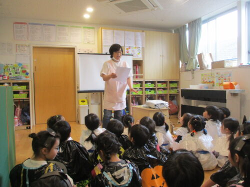 先生からのハロウィンのお話や楽しい絵本を見て、