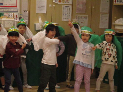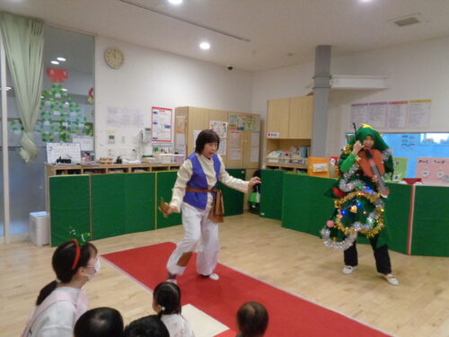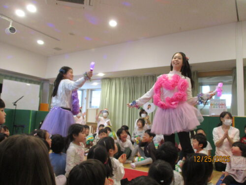 そして先生たちからは、3人のプリキュアによるダンスとアラジンとクリスマスツリーくんによる劇の出し物を披露しました✨