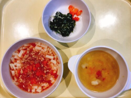 豆たっぷりミートソース 小松菜のツナマヨ和え キャベツのスープ(じゃがいも)