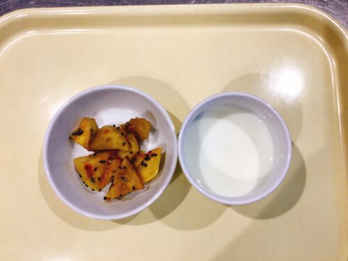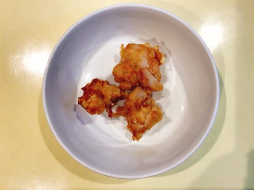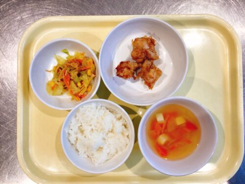 ごはん 鶏肉の唐揚げ キャベツのカレー炒め 玉ねぎのスープ(人参豆腐)