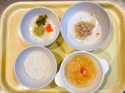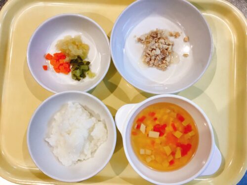 おかゆ 鶏肉の煮物 キャベツの和え物 玉ねぎのスープ