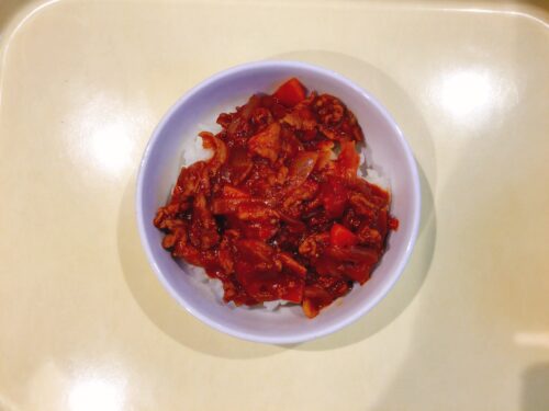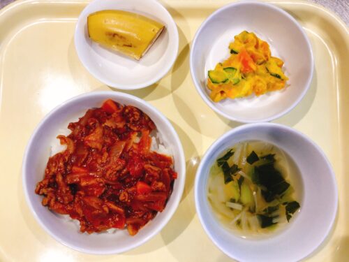 ハヤシライス かぼちゃサラダ 小松菜のスープ(玉ねぎ) バナナ