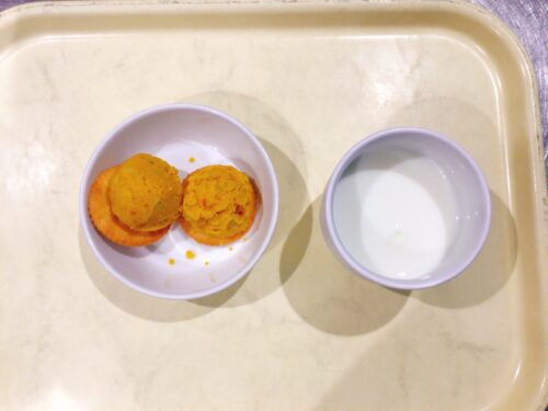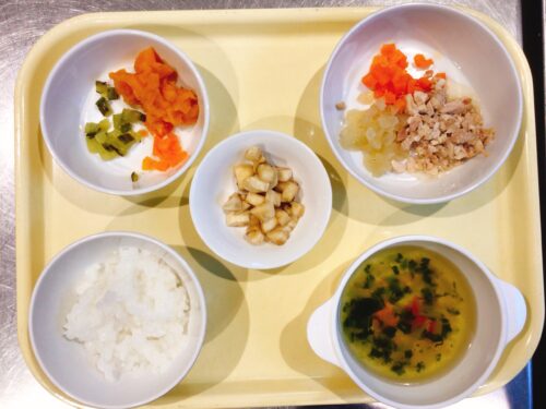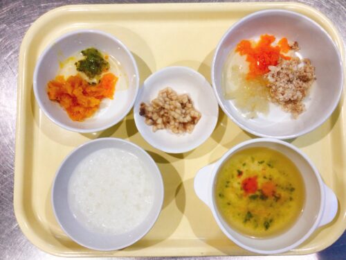 おかゆ 鶏肉と野菜の煮物 かぼちゃサラダ 小松菜のスープ バナナ