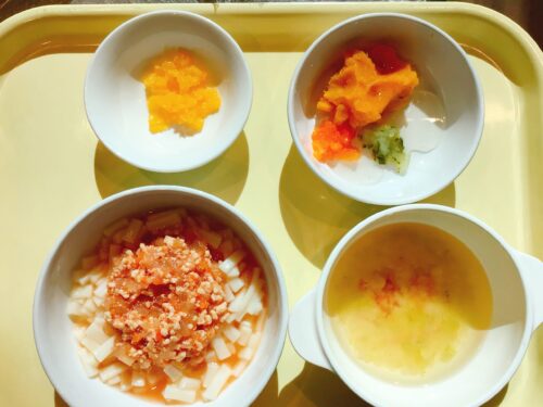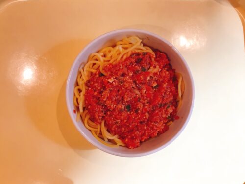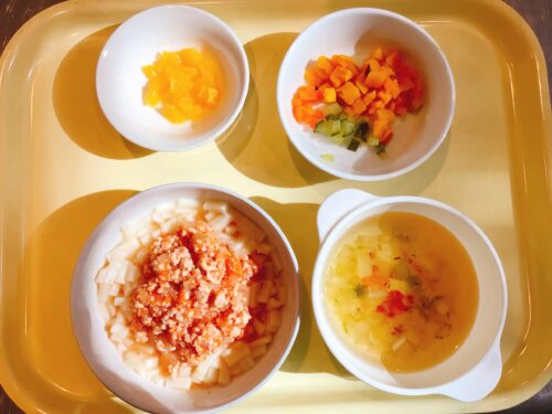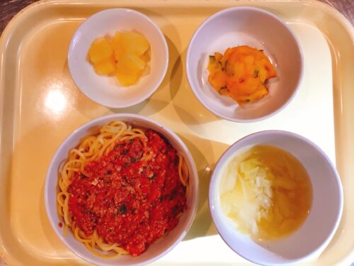 ミートソースうどん かぼちゃサラダ 白菜のスープ オレンジ