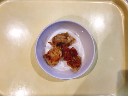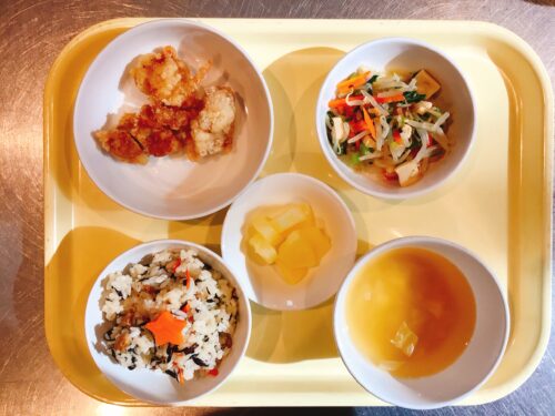 ひじきごはん 塩唐揚げ もやしのおひたし 味噌汁(里芋キャベツ) パイン缶