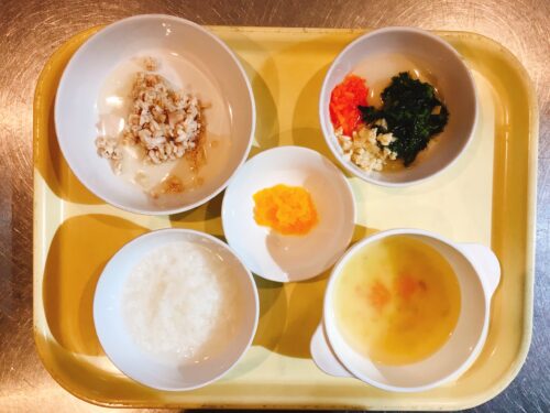 おかゆ 鶏肉の煮物 小松菜のおひたし 味噌汁 オレンジ