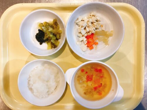 おかゆ 豆腐と野菜の煮物 わかめの和え物 大根スープ